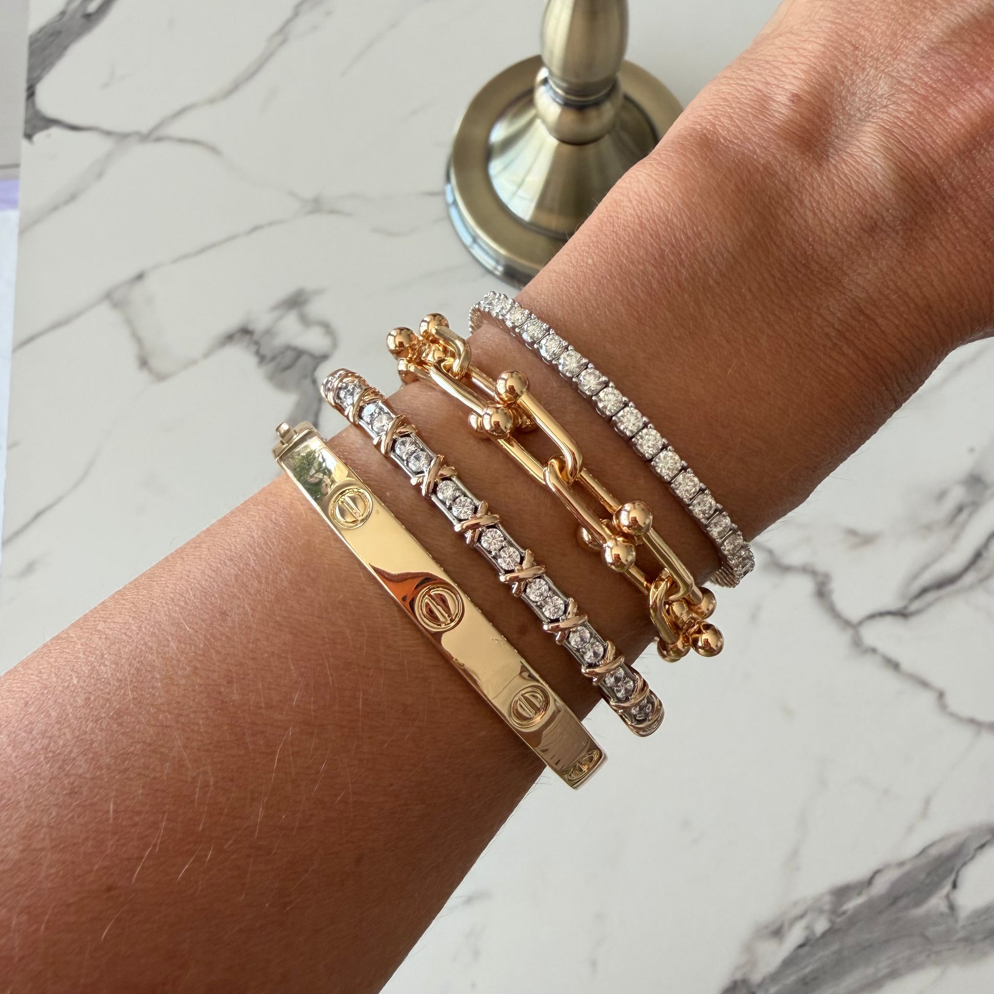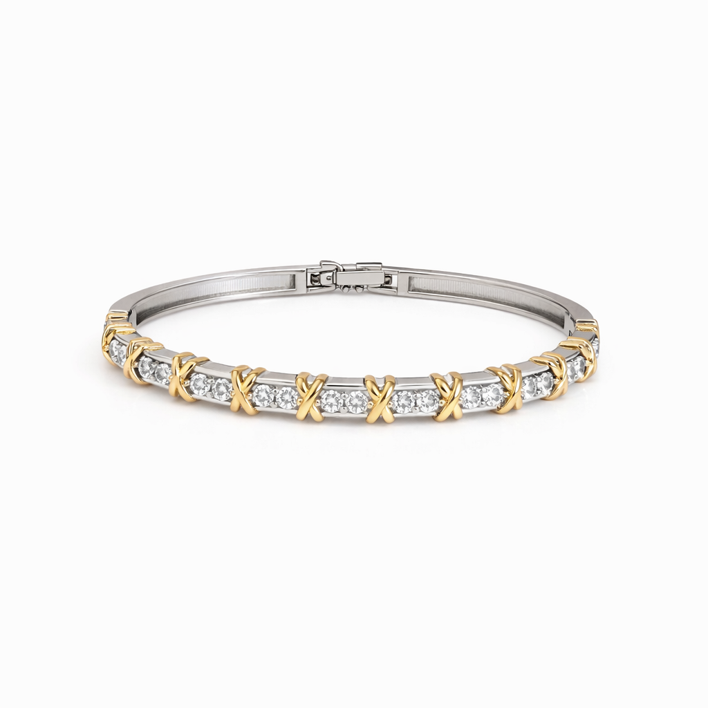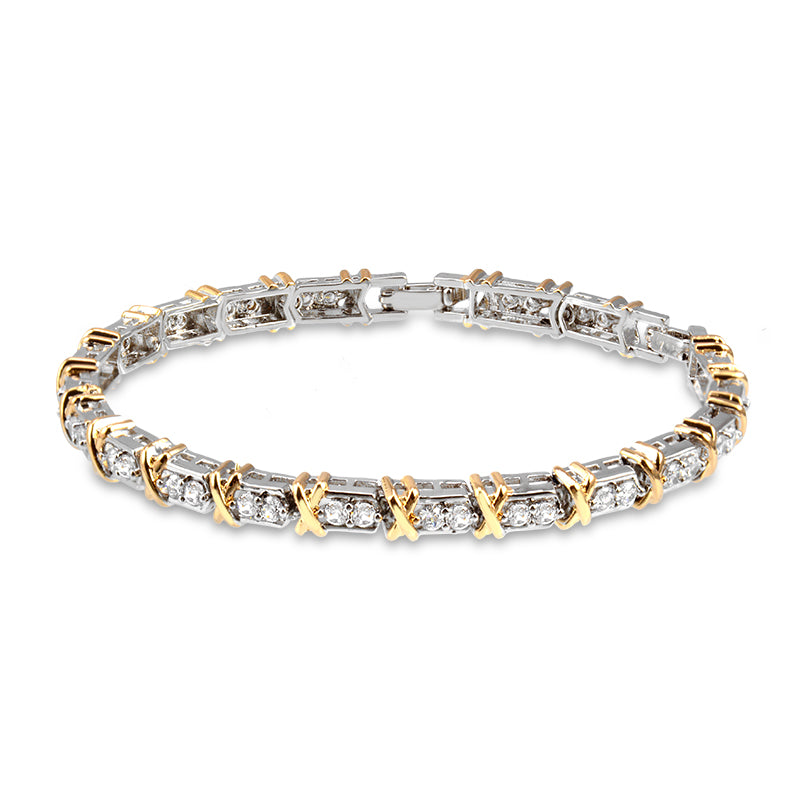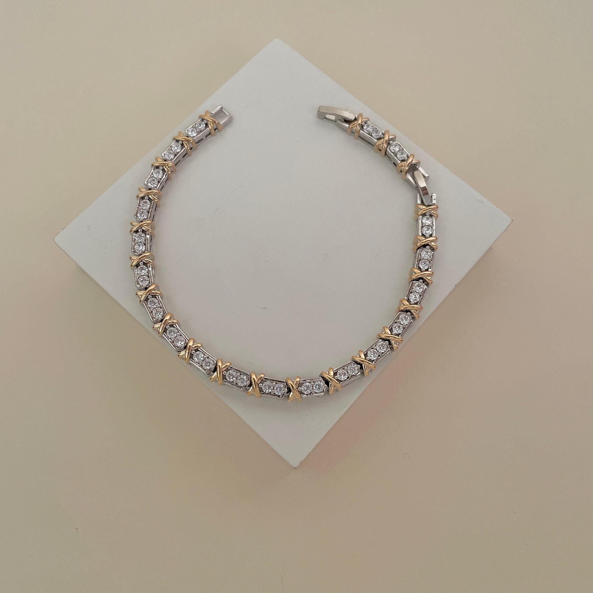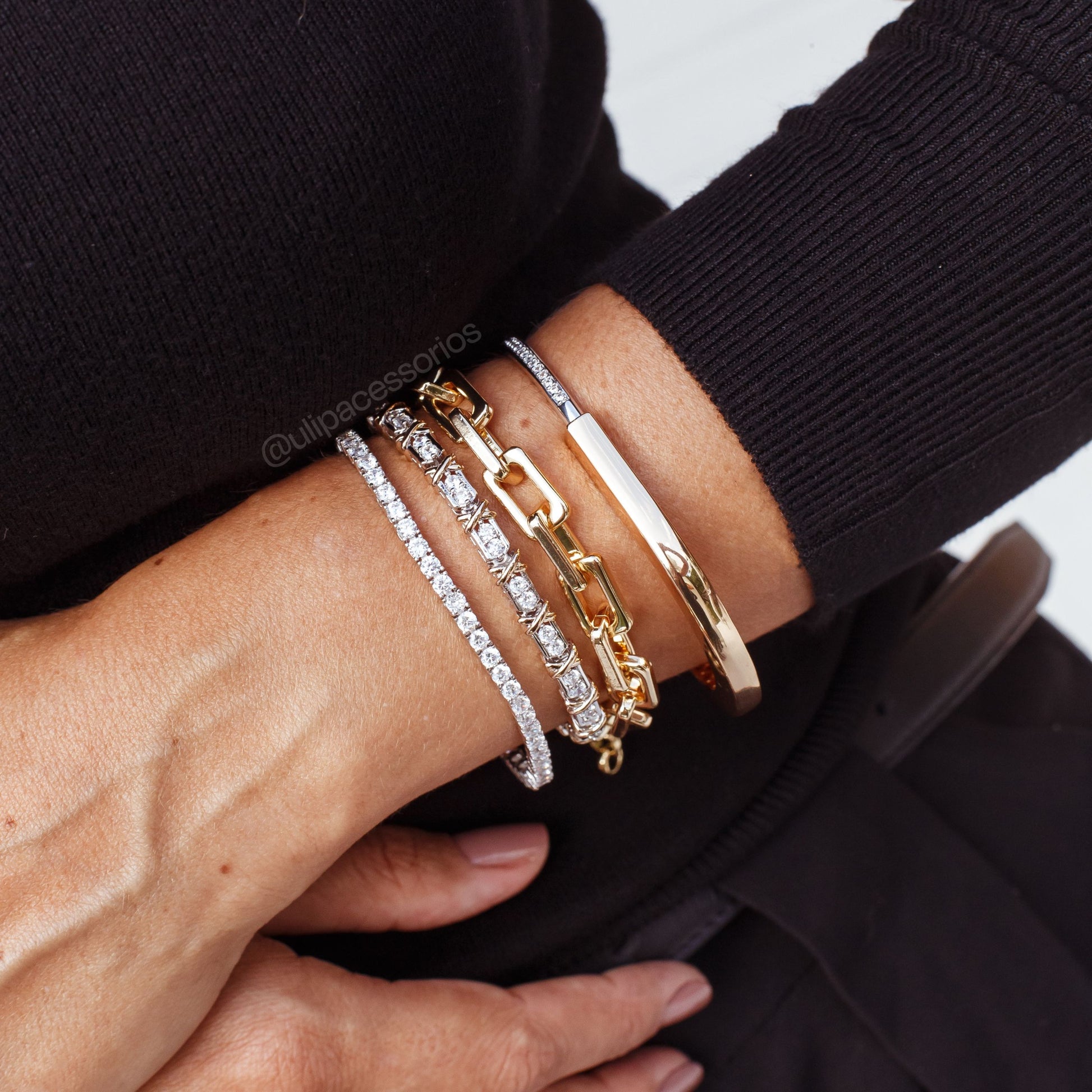 Descubra o luxo e o glamour da pulseira riviera com detalhe em x dourado banhado em ródio branco. Sinta-se elegante e sofisticada com essa joia única e deslumbre todos com seu estilo e bom gosto. Adicione um toque de brilho e sofisticação à sua vida com essa pulseira exclusiva.